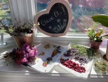 The summer ritual of drying flowers and herbs harvested from my garden. Rose, lavender, and chamomile to make teas, oils, creams, and salves.
